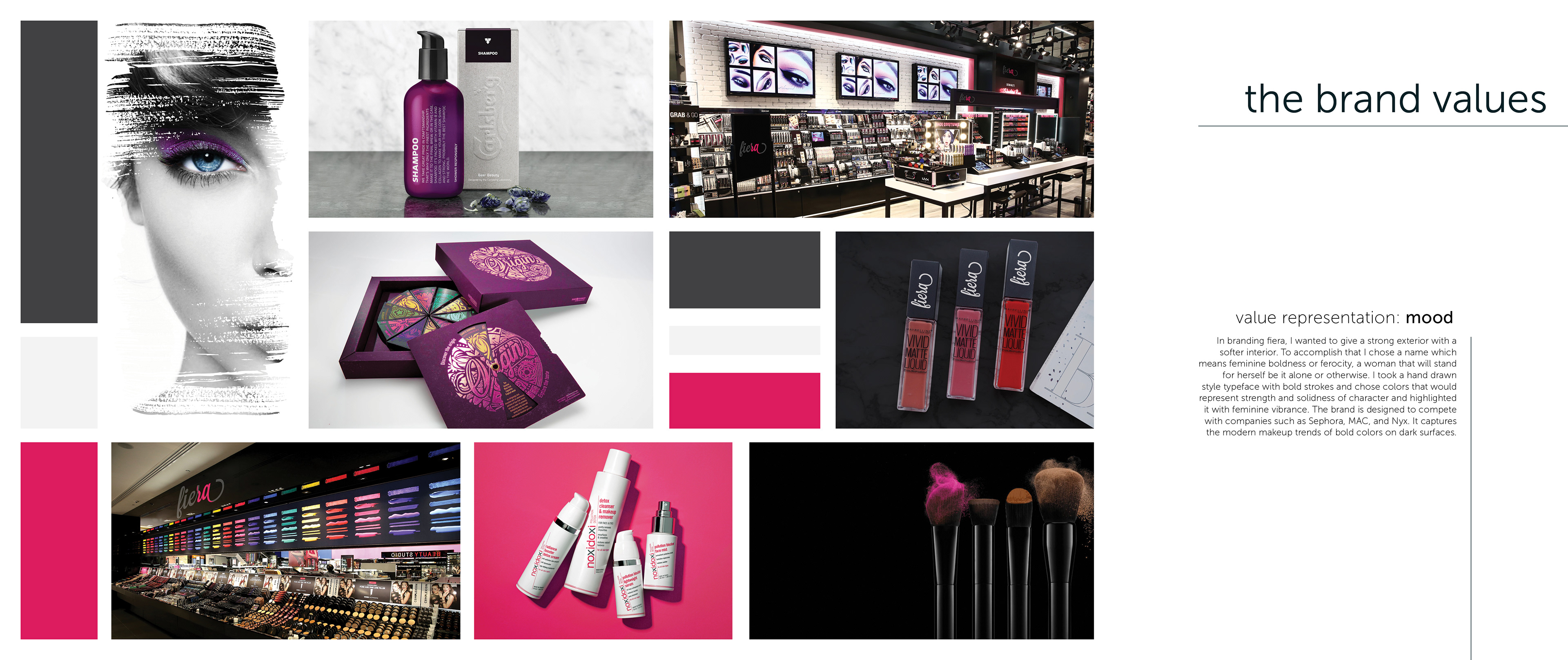 A modern cosmetic brand designed for the modern woman. Fiera is about a woman who exudes strength and boldness all while highlighting her feminine perspective. Fiera is defined as a boldness or ferocity of character and in languages which wield its vocabulary to define masculine and feminine; this word characterizes feminine determination. Fiera is my humble attempt as a male designer to understand and design for a feminine clientele. I hope that in my research and development, I have achieved a small success at reaching this goal. Endeavouring to identifying with a consumer or user whom is unlike myself is a lifelong venture that I look forward to.